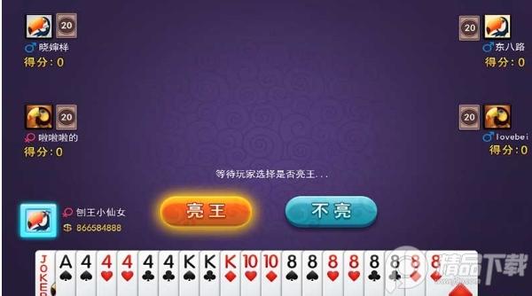 2、每局游戏开始前,如果玩家手中有大王要提前选择是否亮王,只有两个大王全部亮出,亮王才算成功。