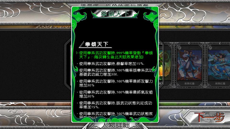 1、本游戏分为四系主角,拳倾天下、剑笑红尘、刀霸无极、特破寰宇。