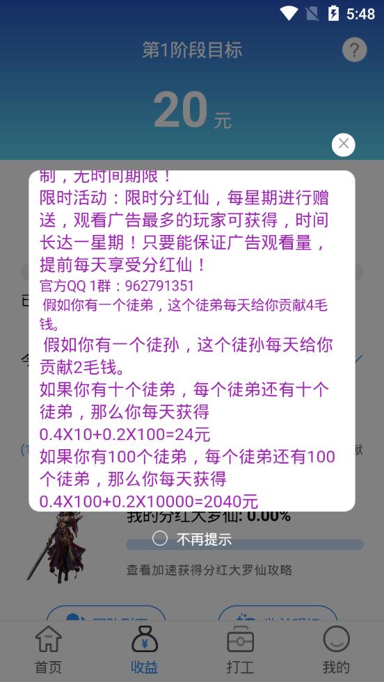 首码《四海八荒》内测,全民修仙合成游戏全面开启!得分红大罗仙每天坐享200元-300元收益!前期高额红包补助,一个月后开启10元无限制提现,两个月后开启5元无限制提现,为了大部分忠实看广告的玩家,就算不去拉人头,也能保证每天都能从游戏里拿到钱!游戏中,每个人都能拿到他的下级广告收益的20%,下下级的10%,无额度限制,无时间期限!限时活动:限时分红仙,每星期进行赠送,观看广告最多的玩家可获得,时间长达一星期!只要能保证广告观看量,提前每天享受分红仙!假如你有一个徒弟,这个徒弟每天给你贡献4毛钱。假如你有一个徒孙,这个徒孙每天给你贡献2毛钱。如果你有十个徒弟,每个徒弟还有十个徒弟,那么你每天获得0.4X10+0.2X100=24元如果你有100个徒弟,每个徒弟还有100个徒弟,那么你每天获得0.4X100+0.2X10000=2040元升级红包(大额度),打工红包(每天领),限时分红(高几率)游戏后期回馈所有玩家,将增加土特产商城(土鸡、土鸭、稻花鱼、河蟹;从全国各地收集土特产,让玩家低价购买),以广告收益进行补助,游戏产出BC可抵折扣,各种特色山水间的野味,全国各区域的风味,直发顺丰,一天到货。只要你还没放弃,我就还能坚持,我们的宗旨就是:让玩家在付出以后,收获切切实实的利益,享受切切。