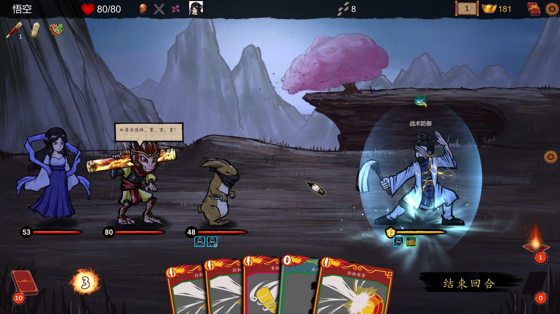 【回合结束】悟空的回合结束后,敌人将进行动作。悟空的回合和敌人回合交替进行,直到一方血量为零败北。