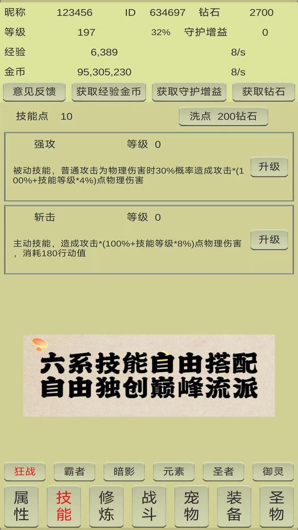 整体挺丰富的,就是养的宠物只能看文字,怪升级可自由分配属性点,六系技能自由搭配