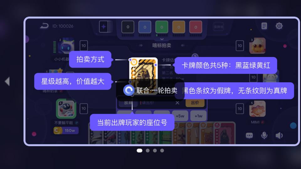 竞标:所有玩家包括卖家自己都可参与喊价,价高者获得卡牌,交付卖家所喊出的筹码金额。如果是卖家自己喊价后没有其他玩家加价,那么由卖家获得此卡牌,并上缴所喊金额的筹码给银行。