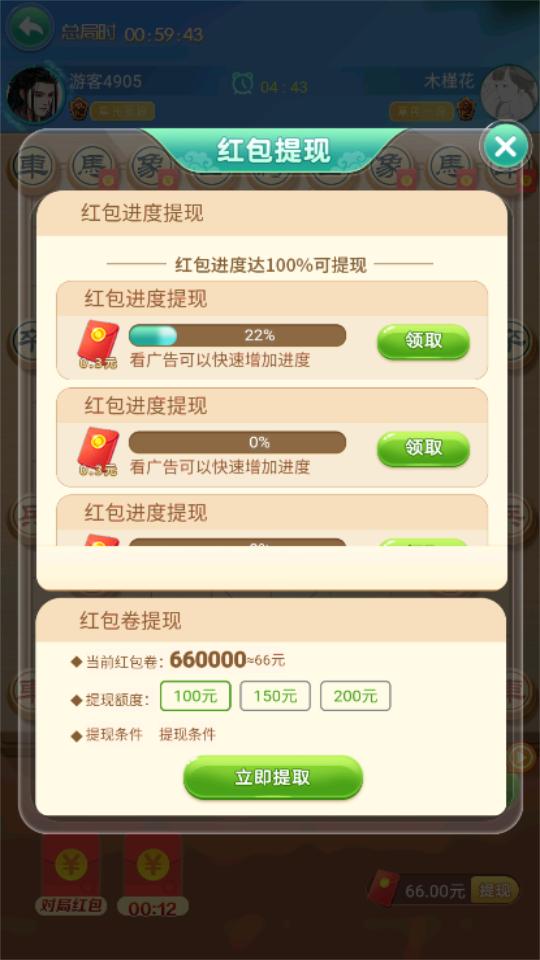 3、完成象棋挑战就能领取红包奖励,还能快速提现,没有任何套路。