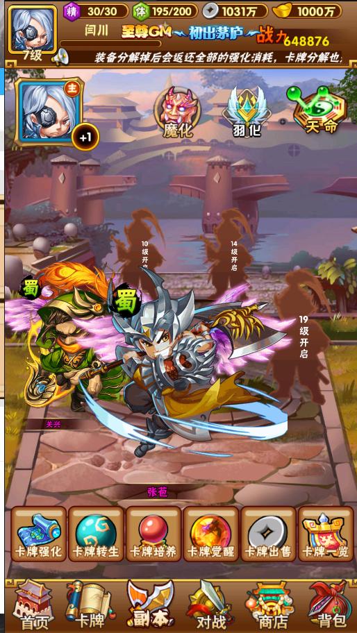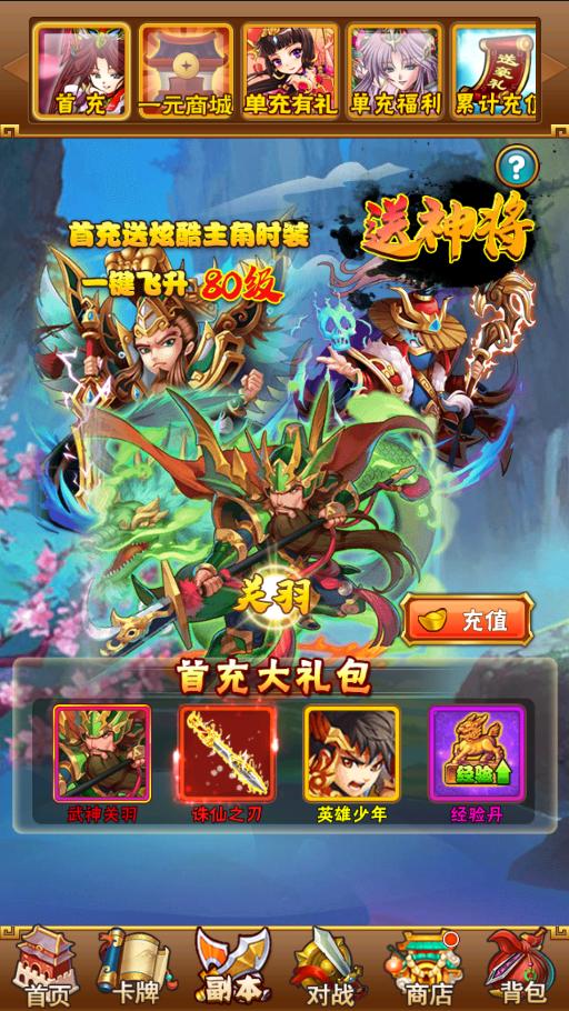 再现乱世烽火,英雄为战而生。在传统卡牌回合对战的基础上,加入个性化主角,将各路三国英雄收归麾下,一路成长为三国之王。首创休闲和战斗结合的挂机玩法,解放双手,照样飞速升级。流畅的动作,绚丽的画面,必将为您带来颠覆性的游戏体验!