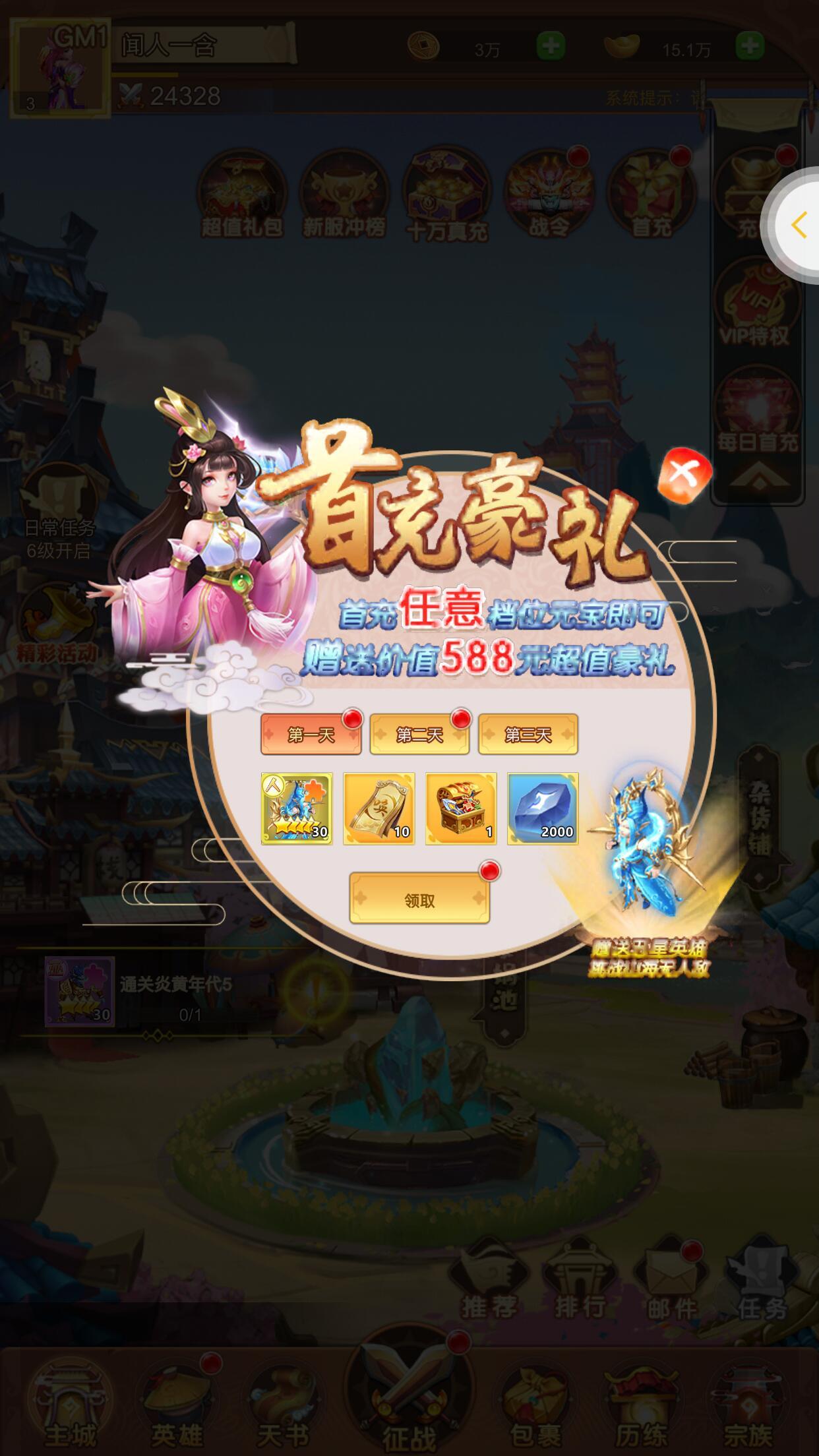 超值首充,赠送山海无人敌-大禹,另外还有一整套金装、高级召唤符等超值奖励.
