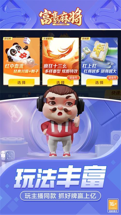 《富豪麻将》是一款经典真人川麻游戏,提供红中血流和经典川麻玩法。该游戏不仅提供线上真人比赛,还能获得线下参赛资格,并且能够在网红大V的直播环节中进行展示。此外,该游戏还推荐全新疯狂十三幺玩法,让玩家享受大胡爽不停的体验。有着众多的游戏玩法和竞技模式,让用户在此畅快淋漓地享受麻将的世界。
