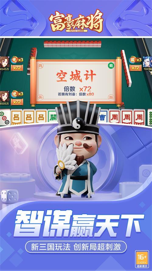 整合非常多热门麻将玩法的一款手机麻将游戏,富豪麻将是一款非常流行的手机游戏,新增了3d角色,三国元素玩法,多种游戏场景支持,优化了游戏界面和场景操作,丰富的奖励和活动,玩家在游戏中享受到最有趣的竞技模式。