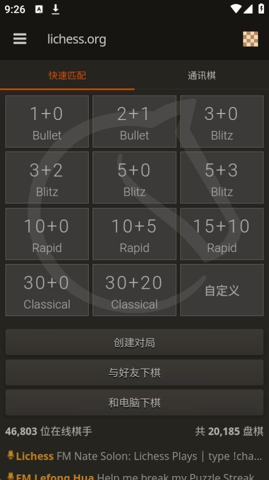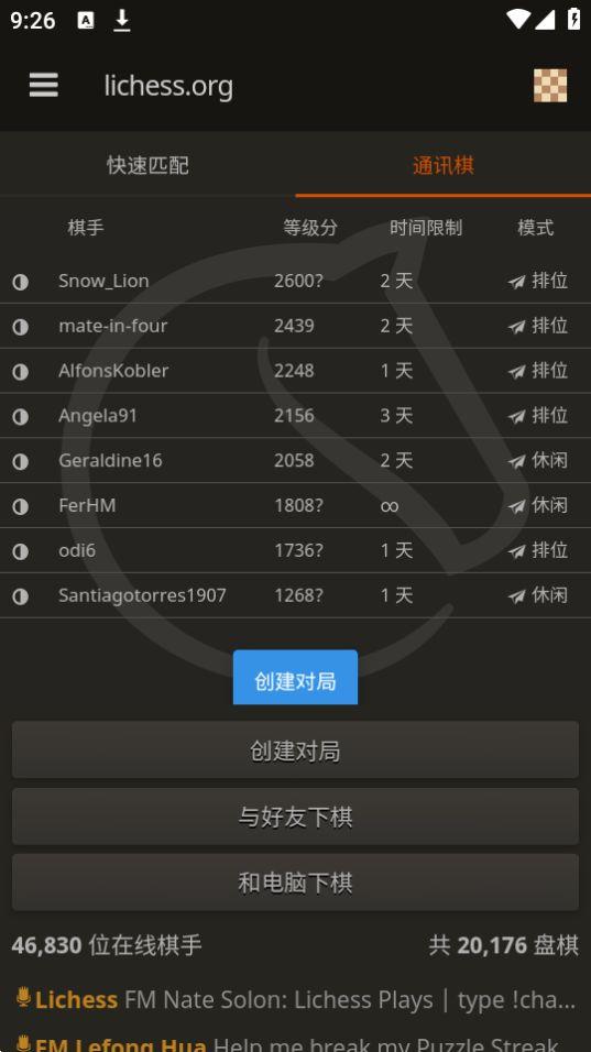 3、除了常见了对弈模式以外,lichess提供各种其他对弈功能:各种时限底至每方15秒;网络赛;团队赛;车轮赛;8种变种国象。
