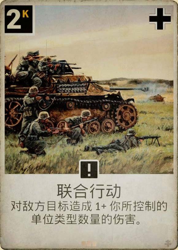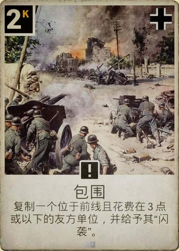 评价:强力的指令,用处来几乎是血赚,即便复制1费甚至是德国火箭炮。复制山地兵,国民掷弹兵和美国海军陆战队几乎是笑烂。德国一般都有喷火坦克,也可以复制。目前为止还没有觉得差评,虽然是指令,但也相当于单位了。加上德国是需要前线的卡组,强烈推荐这张。