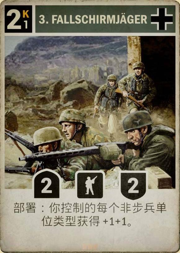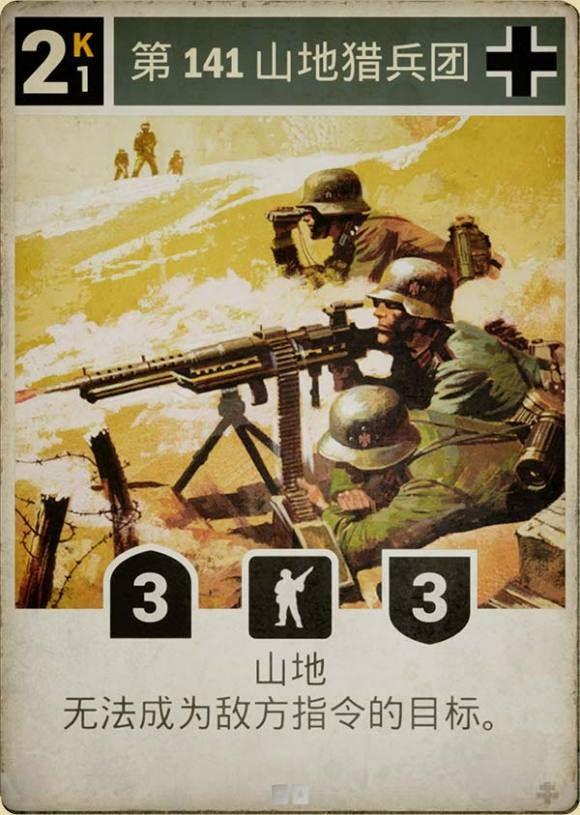评价:快攻重要组件,占领前线至少抽一卡,解不掉连续抽卡,基本上不会亏的单位对面解不掉几乎就胜利了。虽然用途不同,但是个人认为山地兵是德国最优步兵。