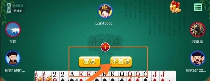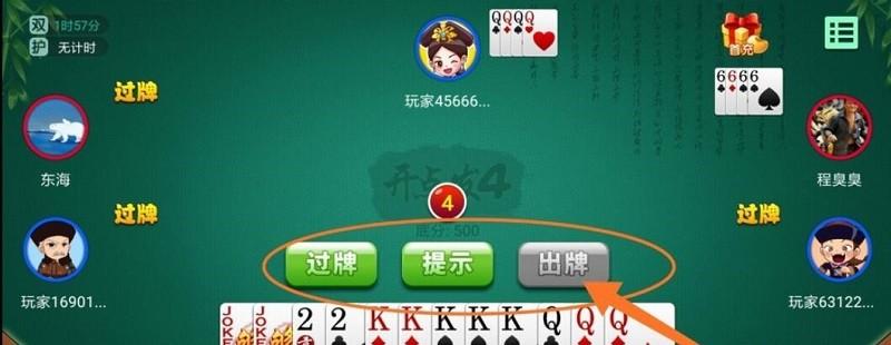 2.挂牌的数量记入你打牌的总数。若挂牌中有小王,则除非接下来的出牌中有大王作为挂牌,否则不能出牌。若挂牌中有大王,则其余玩家都不可以出牌。挂牌与被挂牌的数量之和等于已出牌数量且被挂牌大小大于已出牌。当出牌者一次性打出五张10,或4张J,或3张Q,或2张K,或2张A或多于此数量,且没有挂牌,则称为打出“够级牌”。此时只有出牌者和对门可以轮流出牌,直至一方不出。该轮结束且出牌者获得下轮首先出牌权。称为“开点”。