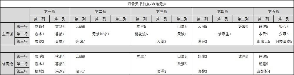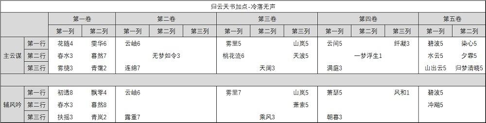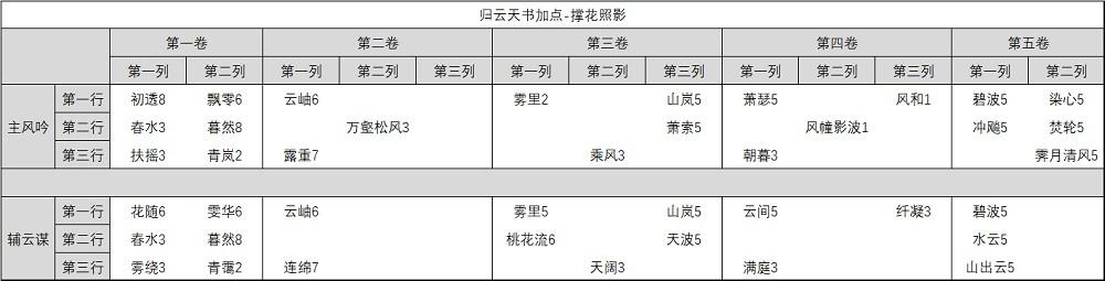 主天书用3雨绝,辅天书选择2云谋提升伤害,在多人场合利用飞花似梦天书的控制也有一定生存能力,但总体生存还是偏低。