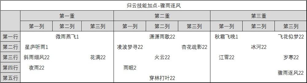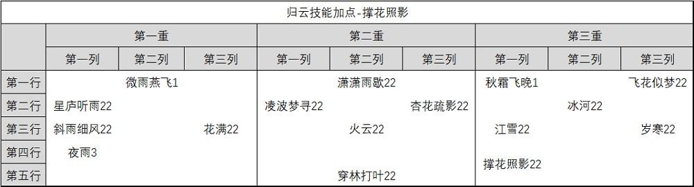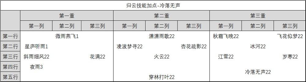 技能加点里,星庐听雨点1级,主要该技能天书是归云唯一的回蓝效果,一般情况不拿出来用。秋霜飞晚在PVP对单时减攻击作用大,需要点满。其他加点没争议。