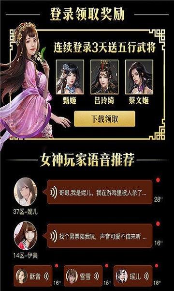 一款比较热门的三国策略冒险类手游你可以在这里去招募很多的武将与你们一起战斗,在游戏中我们可以选取各国名将来帮我们进行战斗,我们做决定前一定要慎重,极致策略经营玩法能给你带来超多乐趣!