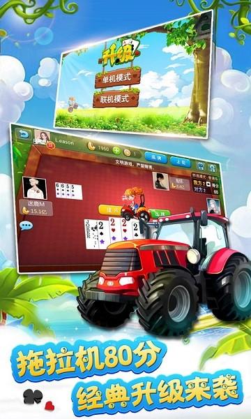 拖拉机,又称为“升级”,“炒地皮”,“双升”等,是一款风靡全国的经典扑克牌游戏。牌局采用四人组队抢分升级的游戏模式,超炫酷的动画搭配刺激炒底的玩法,让你玩到停不下来!清新的视觉体验,欢快的背景音乐,百万真人实时对战,可以在这里尽情享受您的欢快之旅。