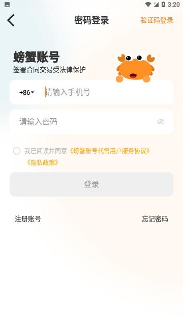 螃蟹账号代售专业版是一款值得信赖的正规游戏交易平台,提供便捷、安全的游戏账号交易服务。在这里,用户可以购买、出售或租赁心仪的游戏账号,享受游戏带来的乐趣。平台提供找回包赔、中介担保、玩腻换号、不玩回收等保障服务,需要的朋友快来下载吧。