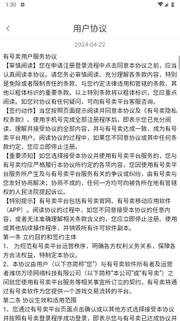 有号卖app是一款游戏账号交易软件,满足用户们各种交易需求,有非常简单便捷的操作,软件专注游戏账号,在线评估和账号交易服务,提供了安全有保证的游戏账号交易,提供了永久的报备服务,所有的账号都可以在线回收,十分的绿色安全。快来下载吧。