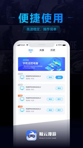 鲸云漫游是一款便捷、安全的远程操控软件,支持移动设备跨平台连接windows系统,高速稳定,畅享高清,随时随地都可以远程控制,传输稳定且安全有保障!-有移动办公、远程游戏需求的小伙伴的理想选择。通过使用鲸云漫游,您可以在连入互联网的地方。随时随地轻松访问和控制异地电脑PC开展工作。-更多功能等你来发现。