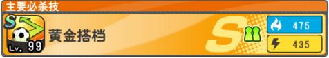 全日本黄金三人组(小翼、岬、葵)所组成的联手攻击。运用直线传球、直角假动作等技巧,一丝不乱地以默契极佳的组合攻击直闯对手球门。本技能在满级时花费380点体力可以释放出350点威力的过人技能。