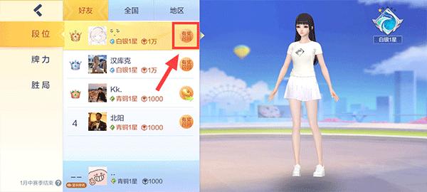 2、点击“段位榜”,弹出段位的排行页面,在页面上可见好友的段位排名和赠送游戏豆的图标。