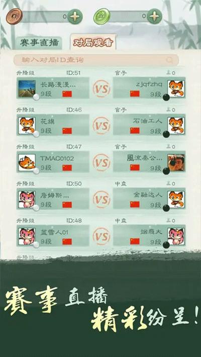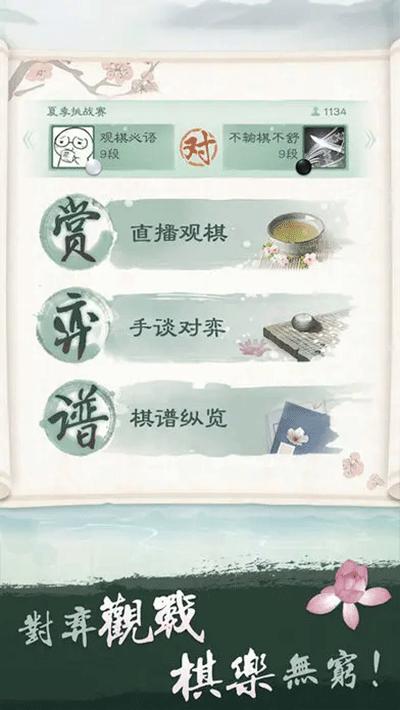 1、集人人对弈、段位升降、人机对弈、打谱复盘、赛事直播、学棋练棋于一体