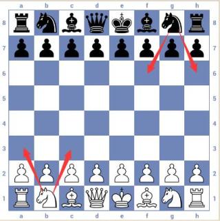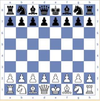 2、国王王后中间放,大象左右在两旁,象旁是马车摆角,八个小兵在前方,白后放在白格上,黑后黑莫要忘(注意白方摆1.2线黑方摆7.8线)
