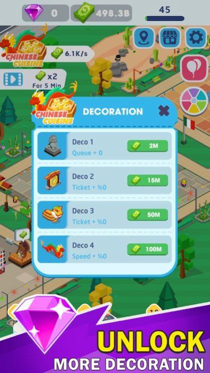 放置美食公园大亨是一款非常好玩的公园建设模拟经营游戏。在游戏中,玩家经营着一个属于自己的美食主题公园。每天的主要任务就是需要为每个游客提供更多的美食,让他们全部都满意,就可以吸引更多的游客。在公园里面可以搭建更多不同的各种设施,包括餐厅和摊位,可以提供各种各样不同口味的各种美食。展示出不同地区的相关特色,让每个顾客都拥有新鲜感。