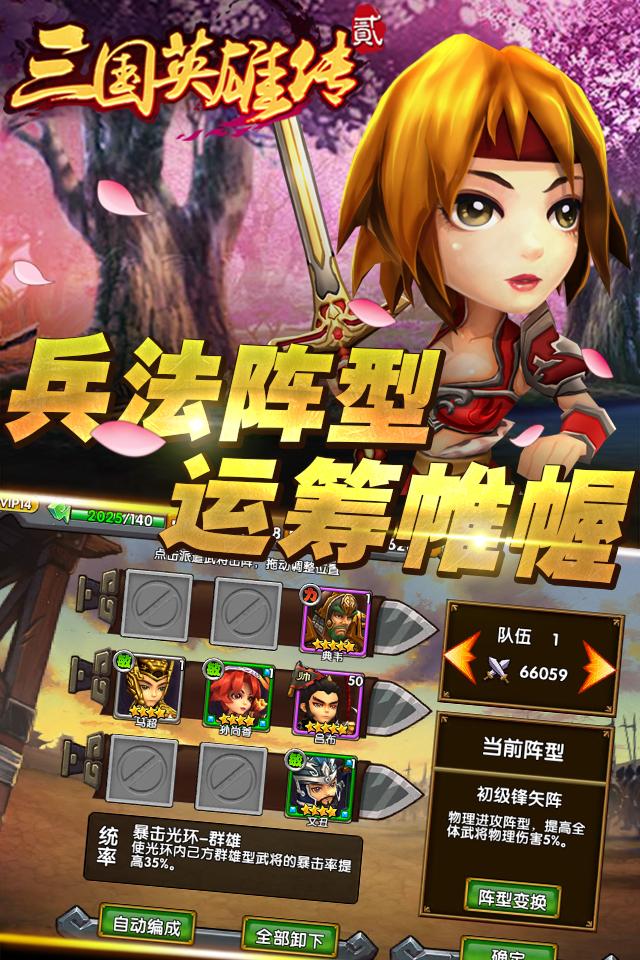 1)游戏取材三国历史,玩家可收集各种三国武将进行培养,打造最强阵容向世界展示你的实力。