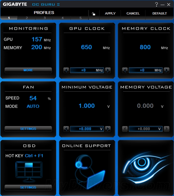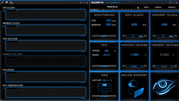 目前OC Guru II支持NVIDIA GeForce 600系列显卡和AMD(ATI)Radeon HD 5000-7000系列显卡,系统方面则支持WinXP/Vista/Win7/Win8 32/64位系统。
