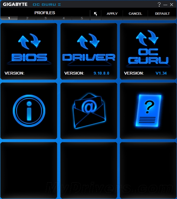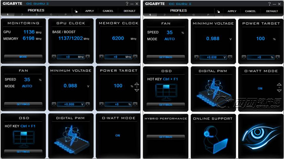 技嘉OC Guru软件升级为了OC Guru II,采用全新的设计,参数调教、监控更方便,当前频率、GPU状态以及风扇转速和电压以及功耗控制等信息即时显示,也可以调整核心频率/电压、内存频率/电压、风扇运作模式等,并可直接在线更新驱动程序、BIOS。