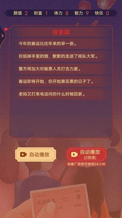春运模拟器手机版是一款休闲益智类游戏。用文字的方式展示一切游戏内容,玩法是很丰富的,玩家可以随时改变故事的走向,构建一个开放式的游戏空间,让玩家收获更多快乐和惊喜,感兴趣的玩家赶紧下载体验吧。