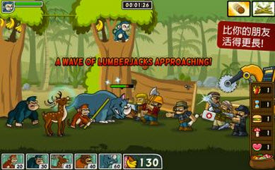 《森林防御战:猴子传奇》(Lumberwhack: Defend the Wild)这么长这么牛气的名字似乎有种想要吓尿玩家的意思,事实上这是一款带有公益性质的休闲小游,主要还是为了向大家传达一种环境保护意识,当然你也可以把它看成是“猴出没”,和我大天朝的《熊出没》一样,在这里玩家需要发动森林里的伙伴们一同对抗前来伐木的工人。