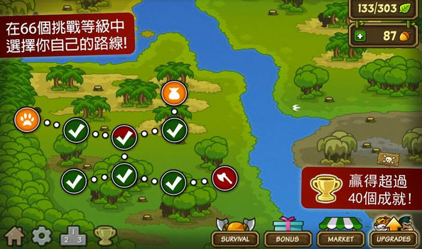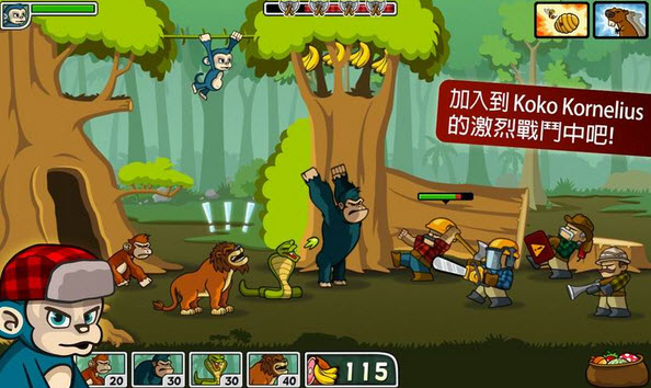 每关都有一定数目的伐木工人来砍树。玩家只能控制一只小猴子,它可以在前线用椰子攻击敌人,也可以摘香蕉和肉去雇佣大猩猩。大猩猩的攻击虽然不是致命的,但可以源源不断的招来。打斗时,地上还会有松果,冒险下树捡来就可以到集市上卖钱。如果关卡中让伐木工人把树砍了就失败,目前小编还处在常胜的级别~保护环境,从游戏做起~话说浓浓的雾什么时候才能散去呢!