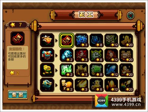 游戏中各种道具不仅可以在战斗场上进行等级提升,还能在系统中进行属性提升,玩家可以通过获胜得到的星星来提升各种防御塔的属性,随着属性的增加,防御塔的攻击形式和攻击效果都将改变,例如弓箭塔的升级,将由传统的弓箭塔改变为远连射、超远程射击、减少建筑金币消耗等效果。游戏中道具的加点效果有些类似RPG的元素,和英雄加点一样,都能让塔防游戏拥有不一样的策略感受。