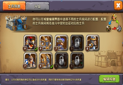 提示:士兵之间存在相克的关系,士兵对其克制的单位可以造成125%的伤害,同时只受到来自其克制单位75%的伤害。