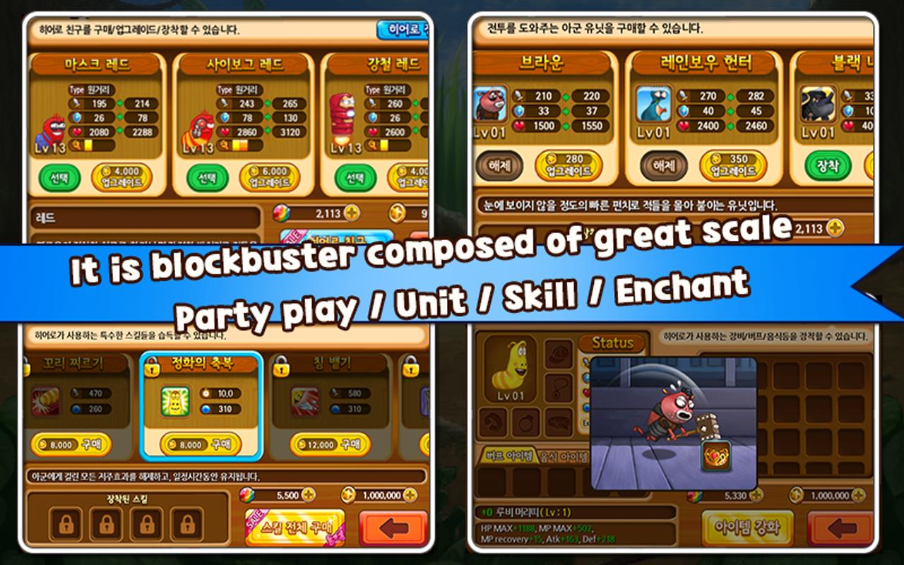 幼虫英雄的原型来自韩国一款超火的动画片Larva Heroes,在游戏中你将控制一只呆萌的蠕虫去战斗,抵御敌人的入侵,本作属对攻型塔防游戏。