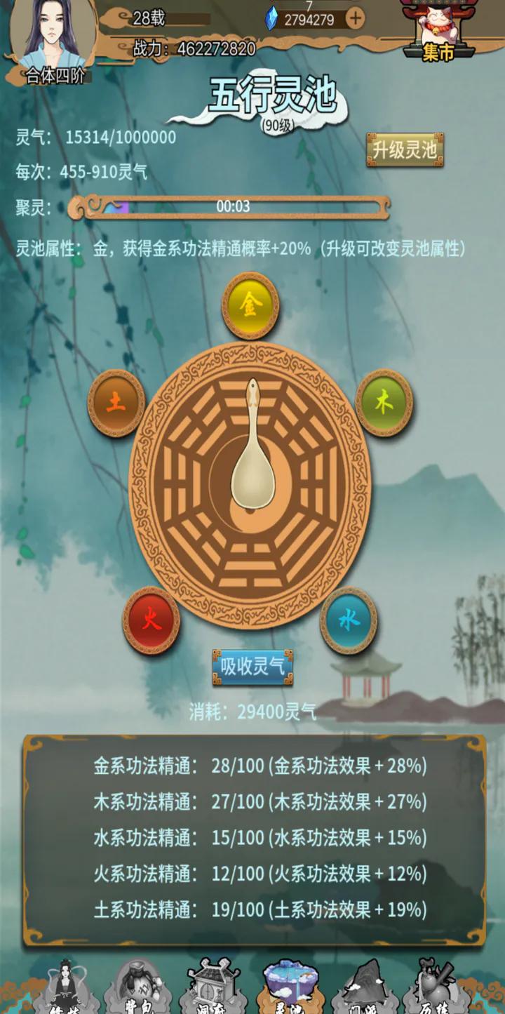 门派奇遇,修炼稀世绝学、聚灵法阵,增进五行精通、洞府经营,挂机获取海量资源