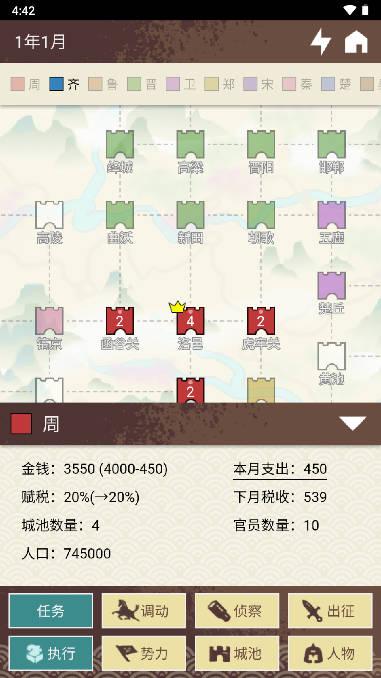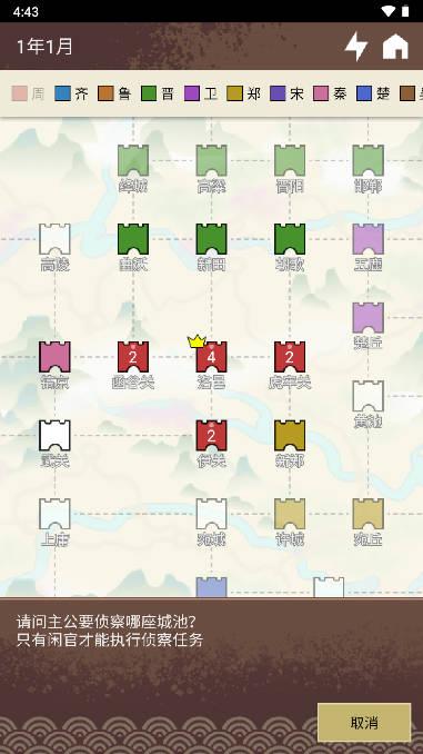 是一款文字类风格的策略战旗游戏。在春秋战国的游戏历史背景下,玩家选择一方势力的君王开启自己一统天下的鸿图霸业。游戏画面非常简约,融合多种战棋元素,在巨幅地图上展现你的绝妙策略,掌控主线剧情,以文字加图画的方式来演绎春秋战国的战争割据场面。在这里你可以招募人才、任命官员、训练士兵、调遣军队、攻打城池,游戏内还有内政模式,玩家既要增加国家的人口和财政,又要对外扩张城池,每一步都要经过深思熟虑。