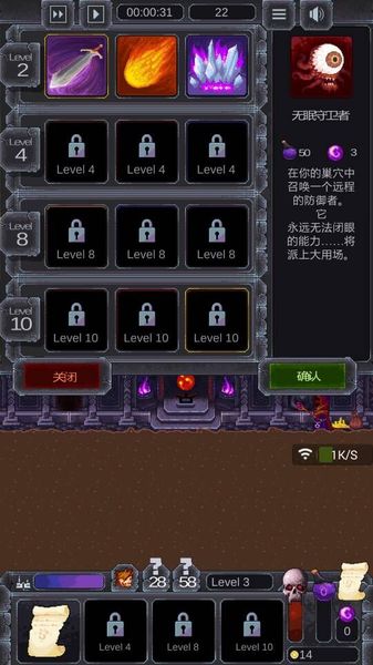 随着游戏的深入,玩家所面对的敌人会变得越来越强大,所拥有的技能也会越来越多样化,而每层地牢却只能放置三个恶魔来抵抗敌人,所以地牢当中恶魔种类的配置就是玩家成功守城的关键所在。除去负责输出的恶魔种类之外,一些辅助兵种也是不可或缺的,比如偷金币的小鬼、能看破隐身的狼、补充能量的小精灵等等。同时,游戏当中还为玩家配置了许多的辅助系统,每当等级升到level1、level4、level8、level10的时候都有一次机会在三个技能当中学习一个技能,每个技能都有着不一样的功效,能在关键时刻扭转局势,且如果玩家对现有的技能不满意的时候,可以花费宝石来重置技能。除此之外,玩家还能使用金币升级恶魔,提高他们的能力,来完成目标。