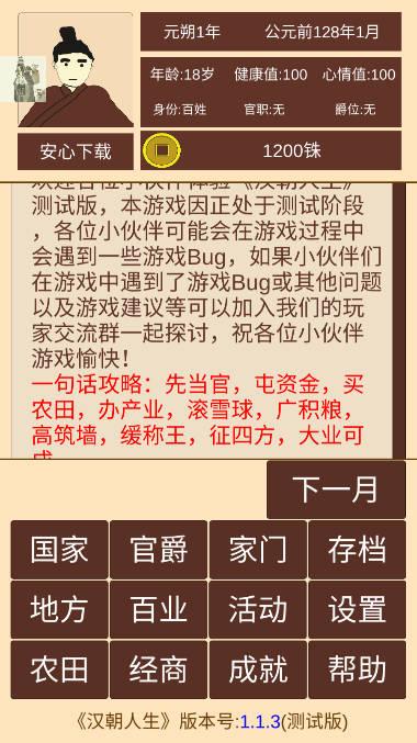 这是一款经典的文字冒险体验游戏,在这里面玩家重生到西汉时代,在这里你可以展开你的人生之路,体验当官人生,在这里一步步发展自己的仕途,免广告解锁各种奖励!