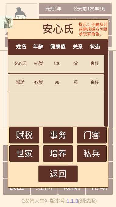 汉朝人生是一款文字人生模拟类型的游戏,游戏内玩家将作为汉朝的一名普通家室开始发展,创新的继承玩法,能够让玩家花费更加久远的时间来经营自己的家族,最终让自己成为汉朝皇帝,玩家在游戏中扮演自己喜欢的角色,在各种故事剧情中做出选择,没种选择都会触发不一样的故事线,非常的好玩有趣。