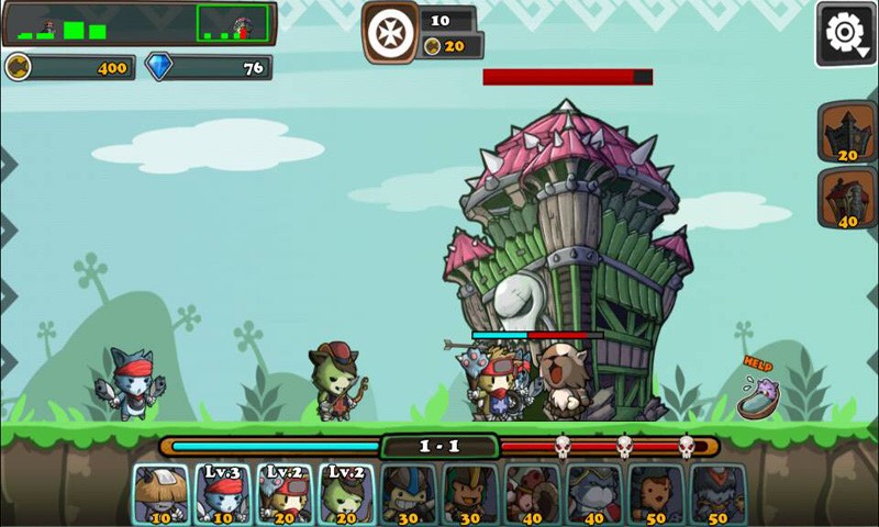 《Q版塔防:猫狗大战》的玩法比较复杂,玩家可以在游戏中训练抓鱼猫,获得资源;建造兵营车间和其他建筑来训练出战猫;升级兵营,提高参加战猫的能力;购买英雄人物,参加战争,上帝咒语会随着游戏的进程而解锁提示:猫狗大作战是一策略性战争游戏,兵种搭配,英雄冷却时间技能,使用上帝咒语可以逆转游戏结果。