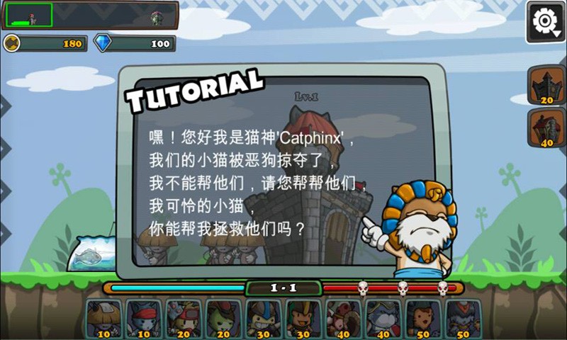 《Q版塔防:猫狗大战》是一款可爱以猫狗为题材的塔防游戏,游戏的背景是在人类文明之前,最平凡宠物猫猫和狗狗两个王国已经建立了他们自己的先前世界,但是较为有力量的狗狗王国攻击猫猫王国,最终失去了小猫而尊严受到了打击。请救救我们的小猫猫!猫猫王国集齐兵力对抗狗狗王国请帮助他们从邪恶的狗狗手上救出小猫猫们。