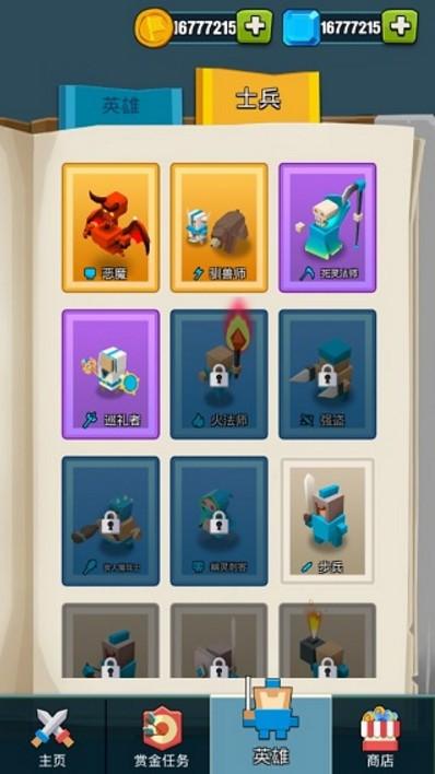 加入了更多的赏金任务和不同的英雄角色,而且大量的功能增加让游戏也变得更加精彩,挑战中你要通过赏金任务的高回报收益完成金币的收集,除此之外还要解锁不同的英雄和士兵类型完善自己的阵容搭配。