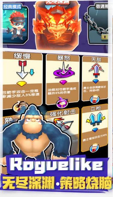 玩家在挑战中要充分的强化自己的英雄,还要利用金币购买卡片,拥有两张同样类别等级的卡片就能合成出等级+1的卡片。