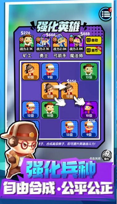 游戏中拥有精彩的合并和升级等养成要素,首先作品中拥有四种不同的兵种都拥有自己独特的功能和特色,设定了矿工、勇士、弓箭手和魔法师。