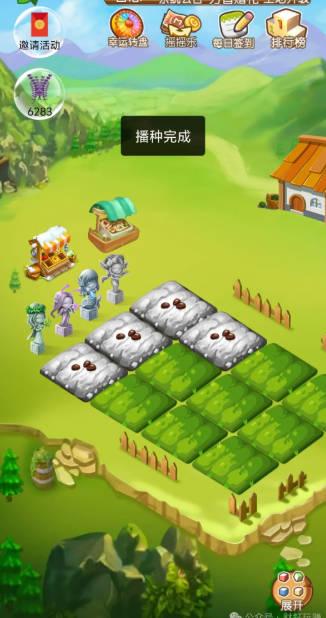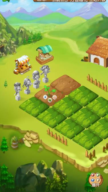 第二步,点游戏界面内的大房子,连续点2次升级(即开辟出2块新土地)。再点击【土地升级】升级3块红土地