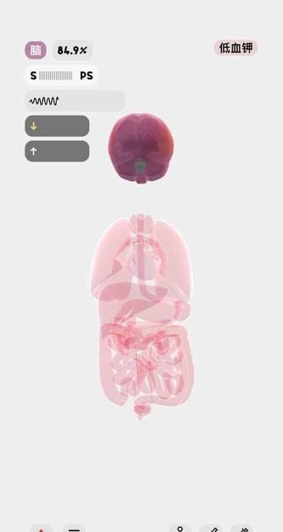 8、屏幕右上角显示的是该人体模型的异常状态,例如现在,她正处于低血钾和低血糖的状态中。
