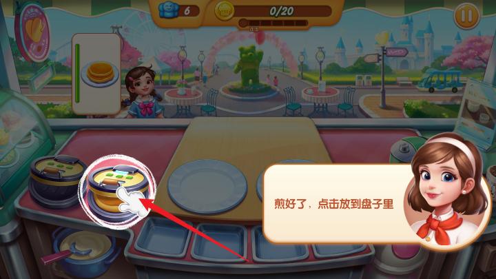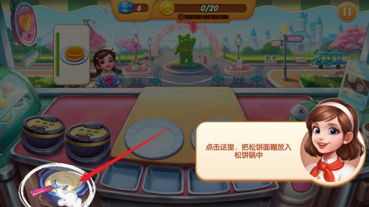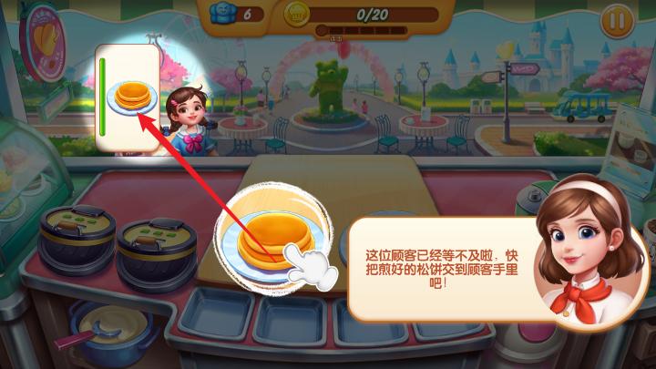 5、这位顾客已经等不及啦,快把煎好的松饼交到顾客手里吧!