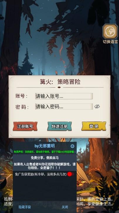 篝火策略冒险免广告获取奖励(com.Campfire_and_Dark_World)是一个冒险类型的游戏,玩家需要通过种族的羁绊进行搭配合理的阵容然后进行战斗,游戏探索元素也是非常丰富,捕捉各种角色,游戏也可以说是一个奇幻世界的冒险游戏,解锁免广告获取奖励。